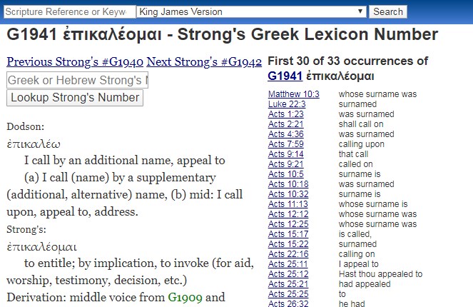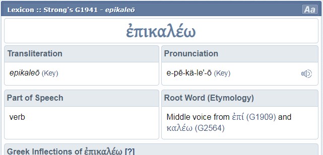 If you click on <G1941> you will get more details, e.g. that the Greek original word is epikaleomai, and listing of all occurrences of this <G1941> word within the New Testament: