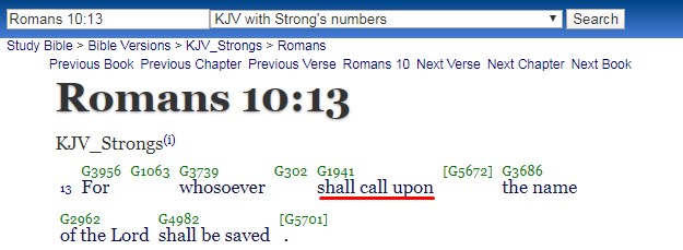 Rom 10:13, KJV: For whosoever shall call upon <G1941> the name of the Lord shall be saved.